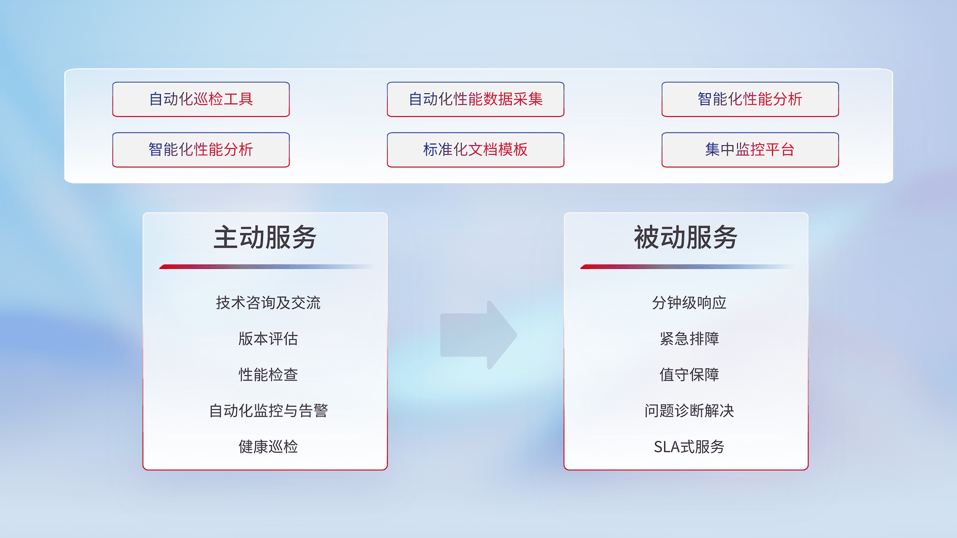 智能化工具和标准化文档,,,,保障服务质量,,提供主动服务(包含技术咨询、、、、版本评估、、性能检查、、、自动化监控与告警、、健康巡检)和被动服务包含(分钟级响应、、、、紧急排障、、值守保障、、问题诊断解决、、、SLA服务)。。。。