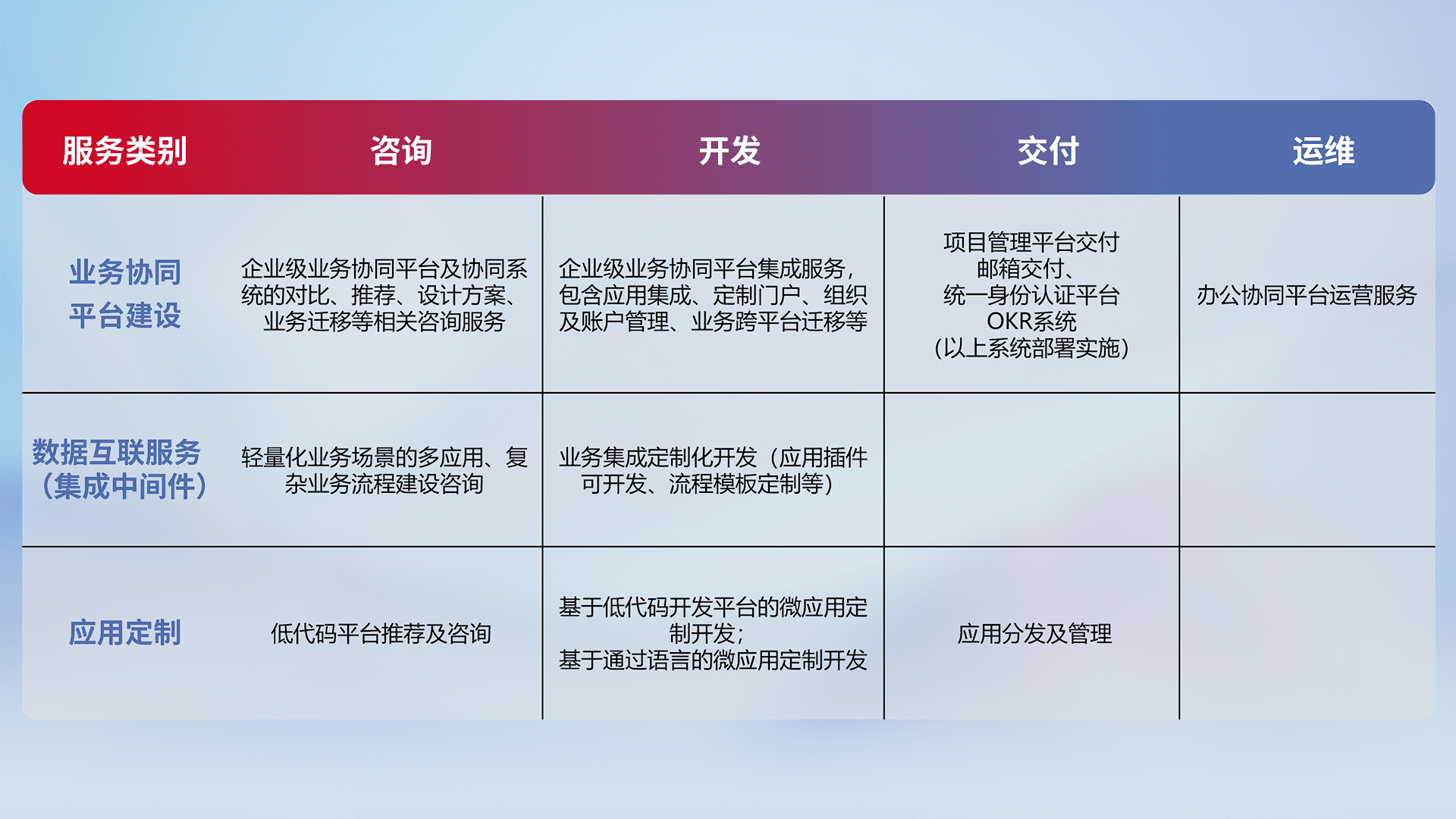 针对钉钉、、企微、、、IDaas等平台级产品提供产品的规划、、、、方案、、交付、、、定制化开发等服务,,,实现如统一协同办公、、、、智能客户服务、、混合会议管理、、、、智能数据查询、、、、等业务场景,,,,实现数字化转型。。